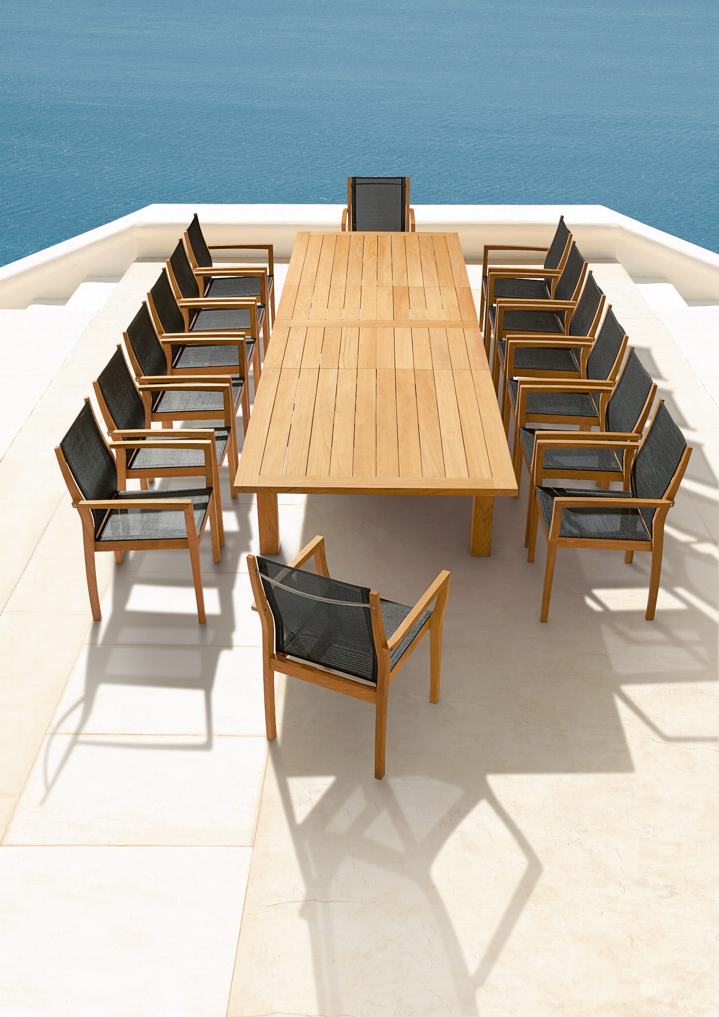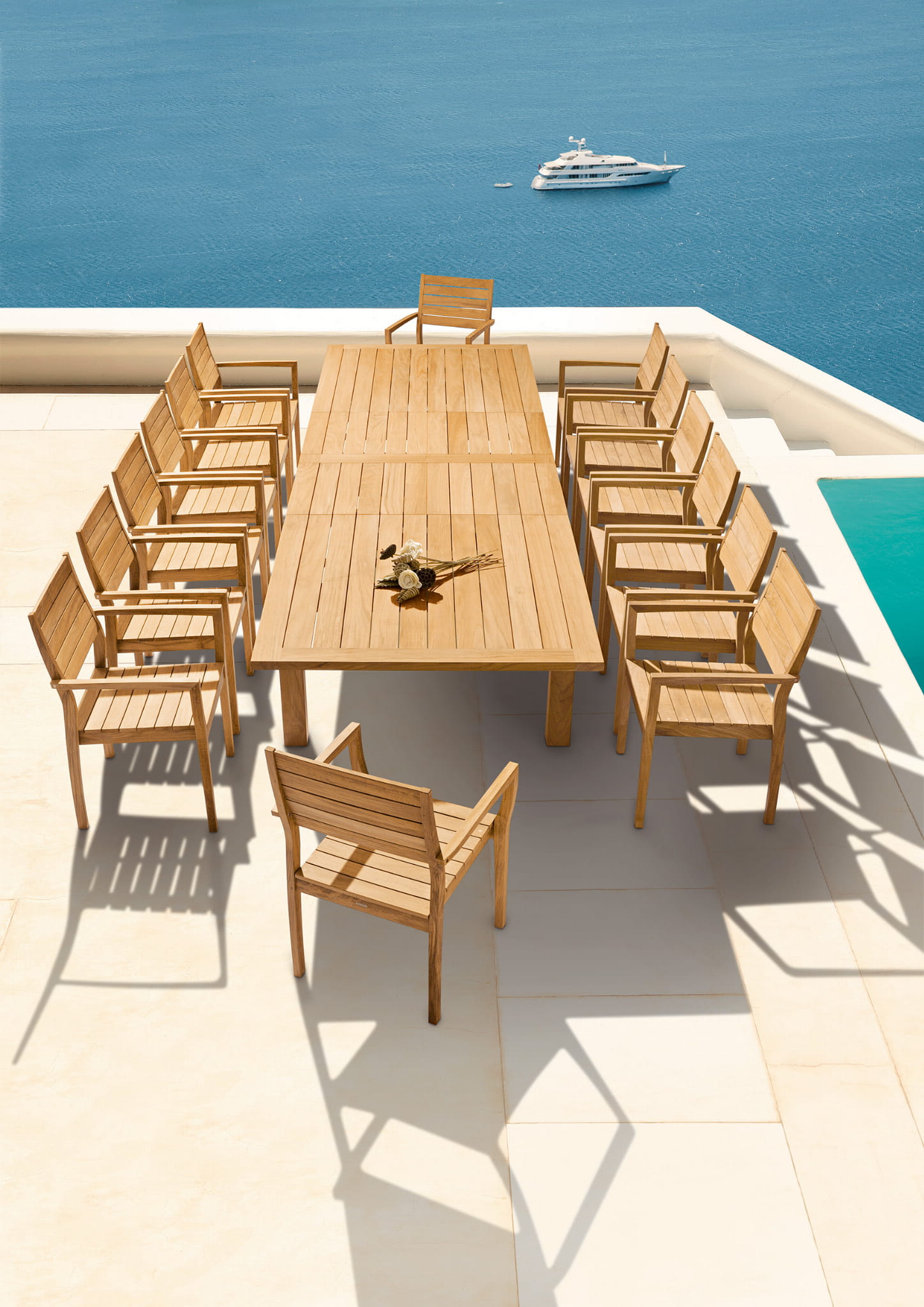 W kolekcji znajduje się stół rozkładany, z naturalnego drewna tekowego, dzięki prostocie, większość krzeseł innych kolekcji będzie idealnie pasowała.