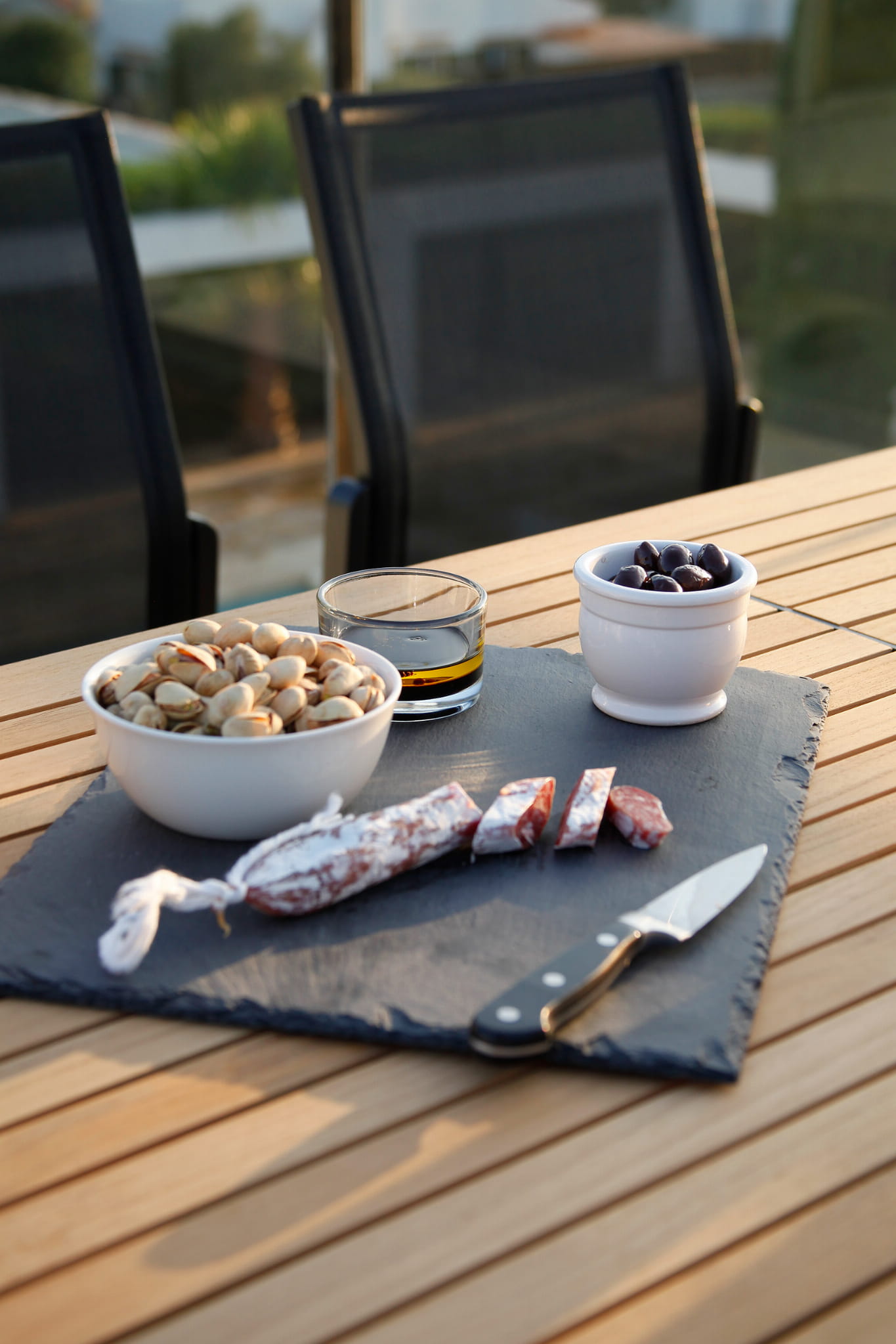 Ta seria pięknych aluminiowych mebli do jadalni jest bardzo lekka, dzięki czemu korzystanie z niej jest przyjemnością. Oferta obejmuje stoły w różnych rozmiarach z blatami z drewna tekowego oraz krzesła. Ramy pokryte są malowanym proszkowo aluminium. Blat zrobiony jest z drewna teakowego oraz posiada otwór na parasol z pasującą zaślepką.