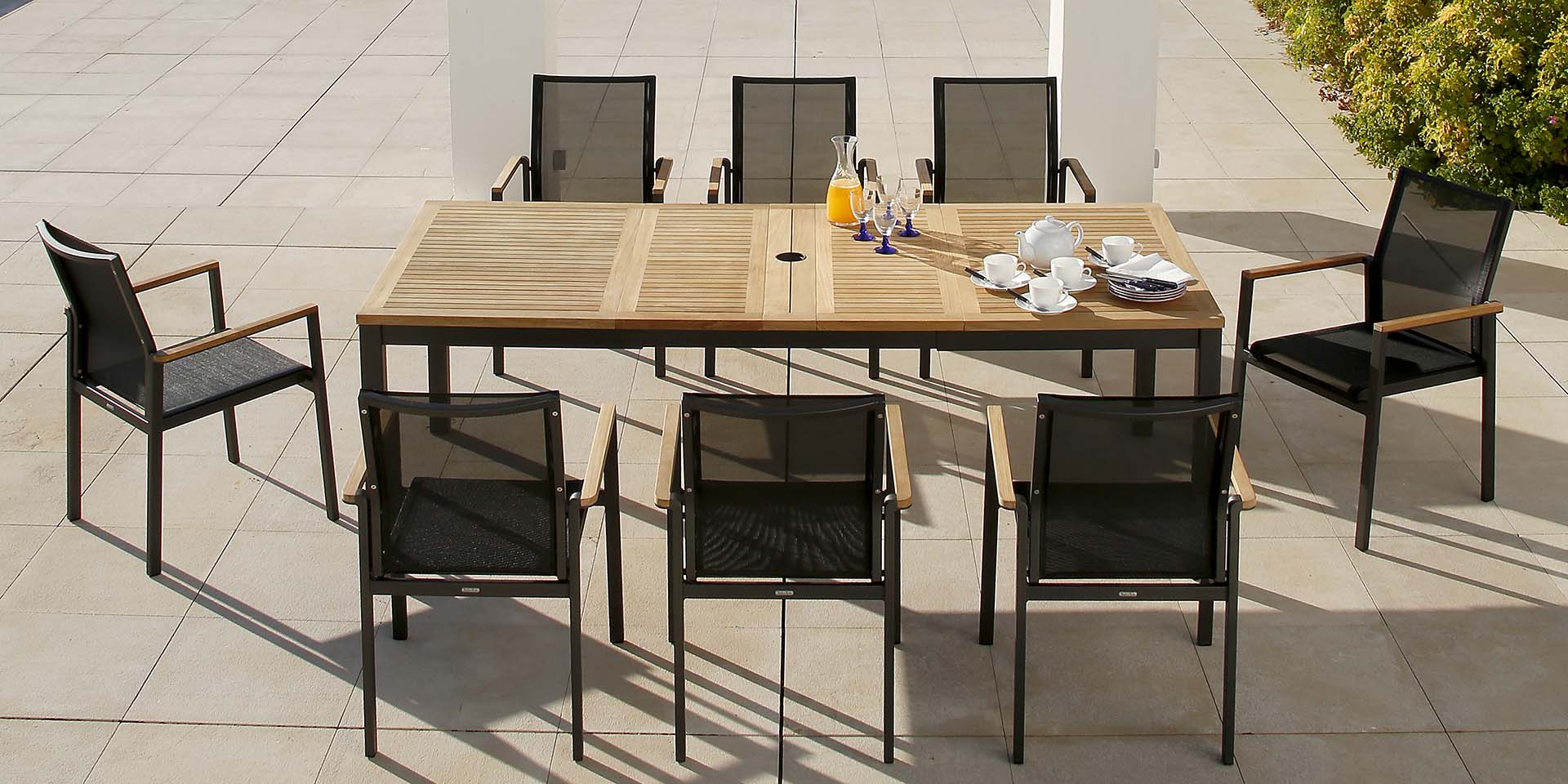 Ta seria pięknych aluminiowych mebli do jadalni jest bardzo lekka, dzięki czemu korzystanie z niej jest przyjemnością. Oferta obejmuje stoły w różnych rozmiarach z blatami z drewna tekowego oraz krzesła. Ramy pokryte są malowanym proszkowo aluminium. Przeznaczony dla 6, 8 osób.