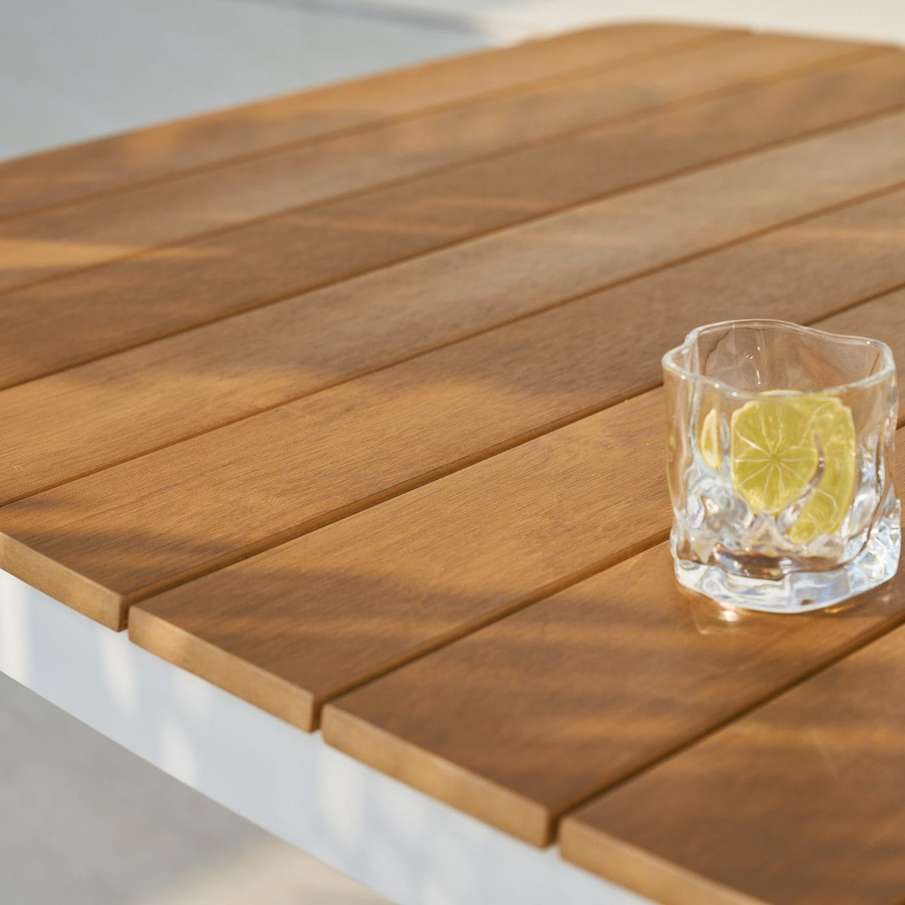 Zestaw oferuje komfortowe miejsce dla 8 osób, dzięki długim ławkom umieszczonym po dwóch stronach stołu. To idealny wybór do nowoczesnych tarasów, ogrodów i przestrzeni komercyjnych.