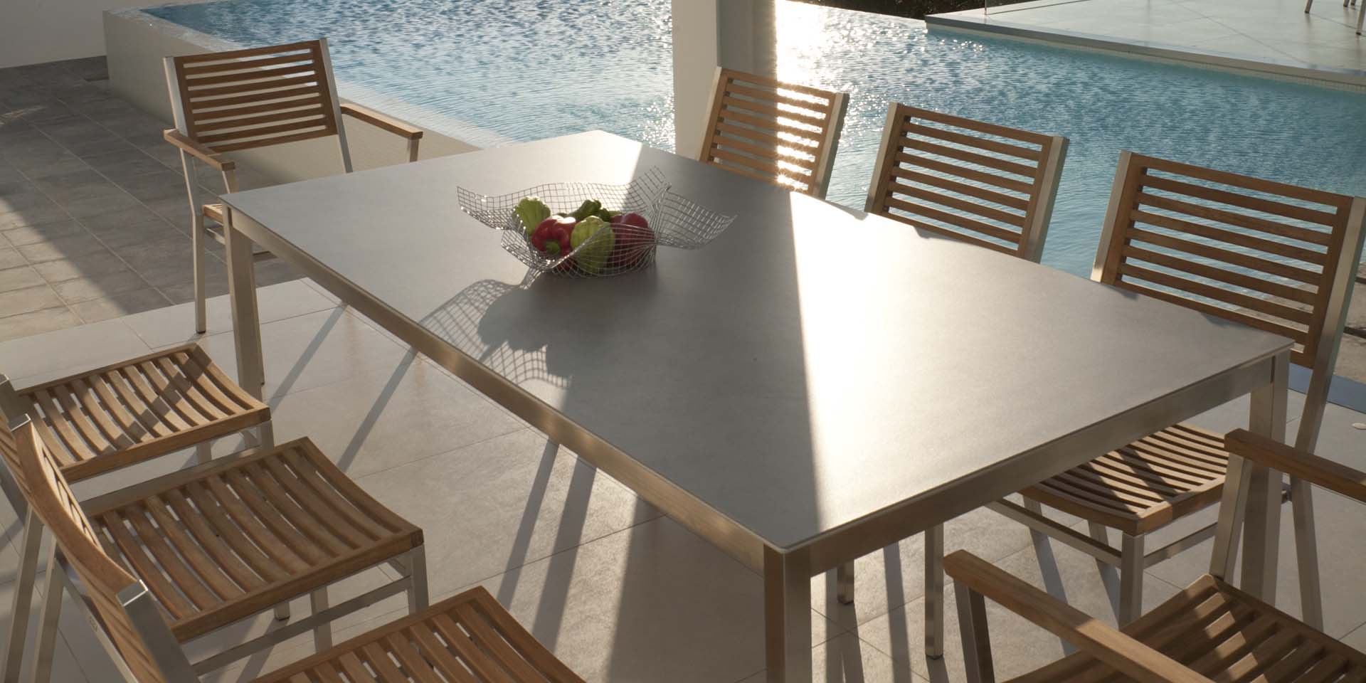 Szeroka gama krzeseł i stołów do jadalni, które łączą stal nierdzewną 316, Textilene® i teak. Blaty z włoskiej ceramiki High Fired zostały dodane do asortymentu w pięciu kolorach.