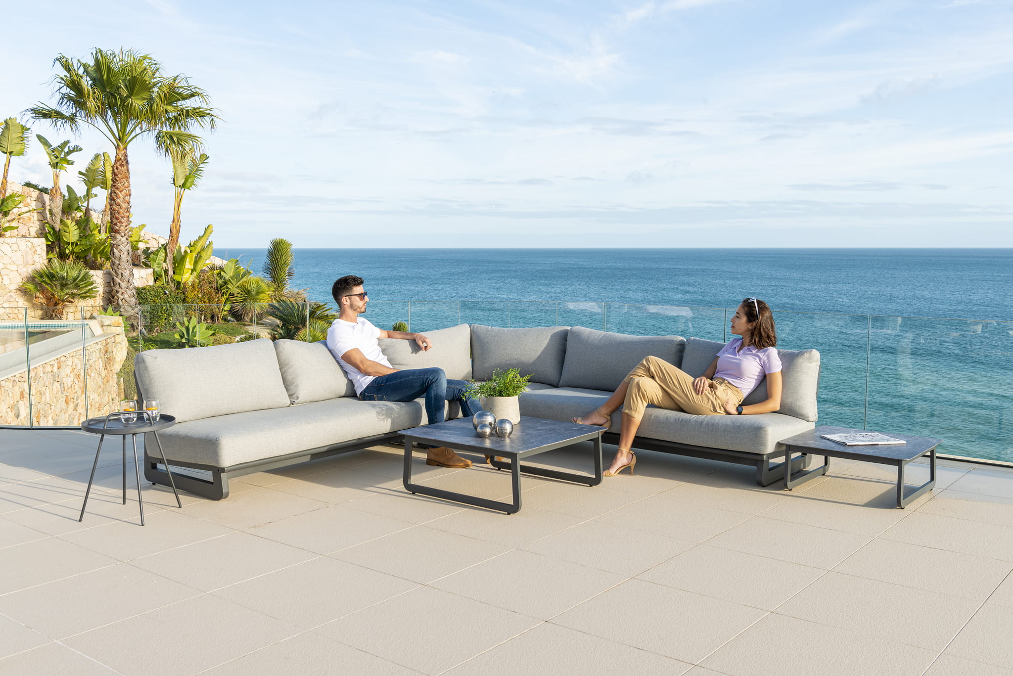 Najwyższej jakości aluminiowe ramy malowane proszkowo na szary mat w połączeniu z efektownymi blatami z szarej ceramiki imitującej kamień. Dobrze dobrane materiały sprawiają, że meble są odporne na czynniki zewnętrzne, dzięki czemu można cieszyć się wypoczynkiem przez wiele lat.